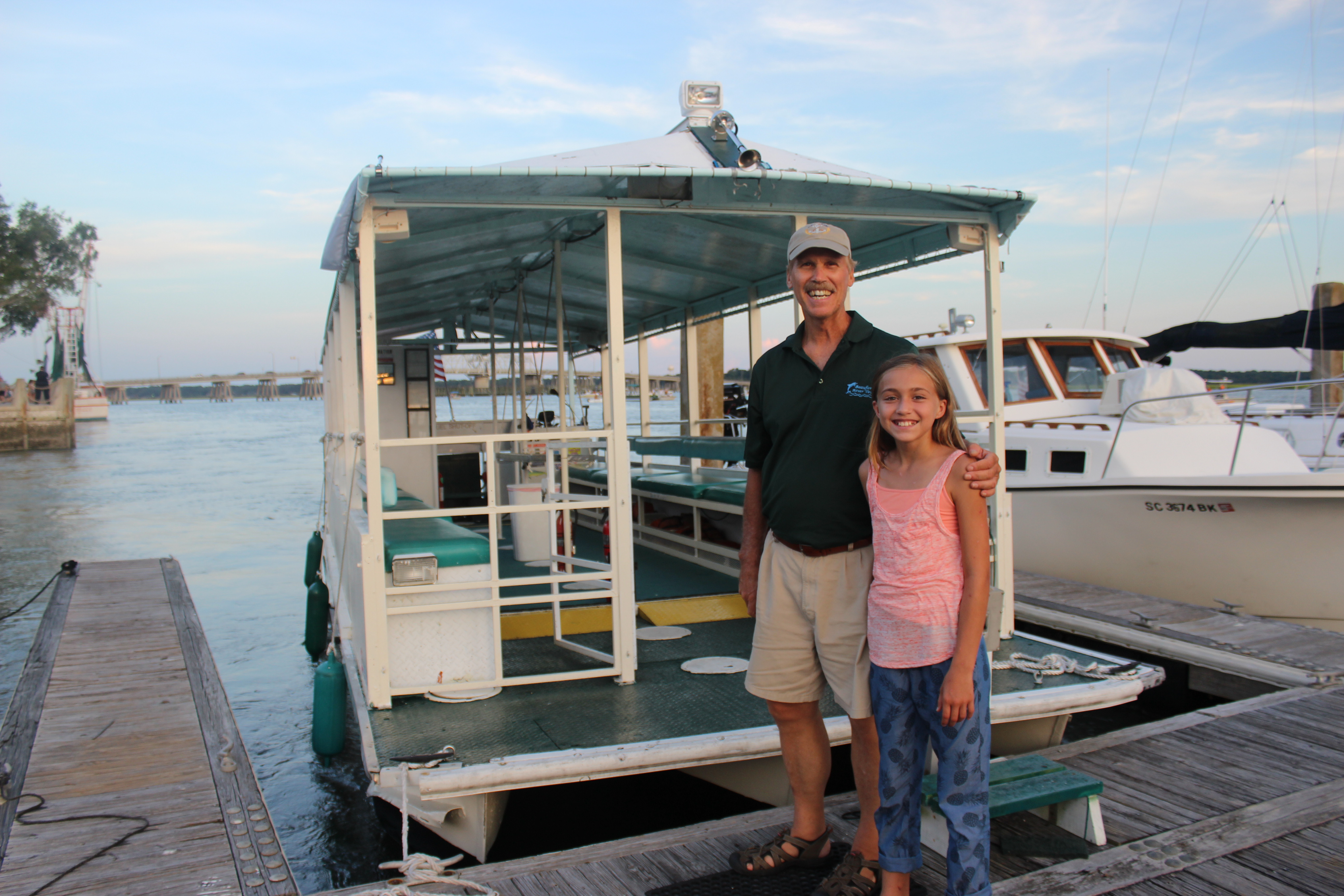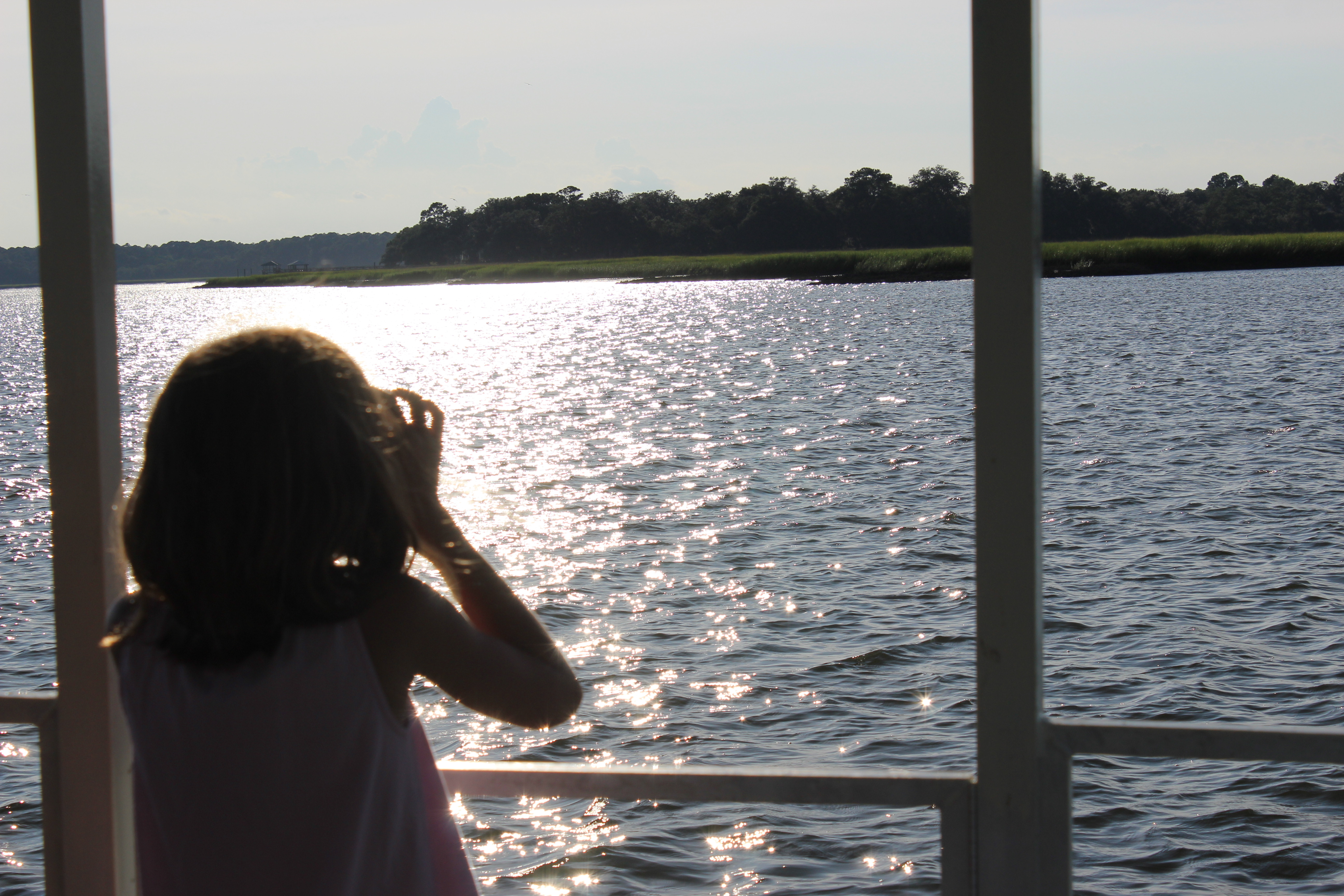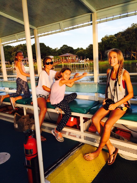Carmen on the lookout for dolphins Me and my sisters Driving the boat with my co-captain Lady’s Island dolphins my mom and sisters Sunset and the bridge into Beaufort